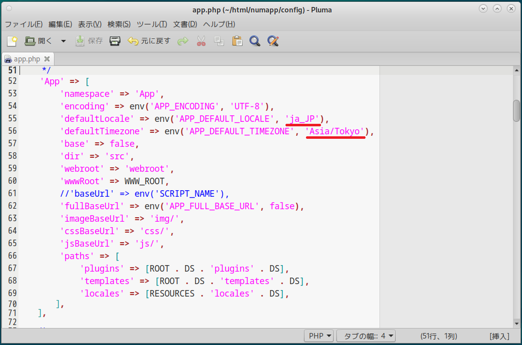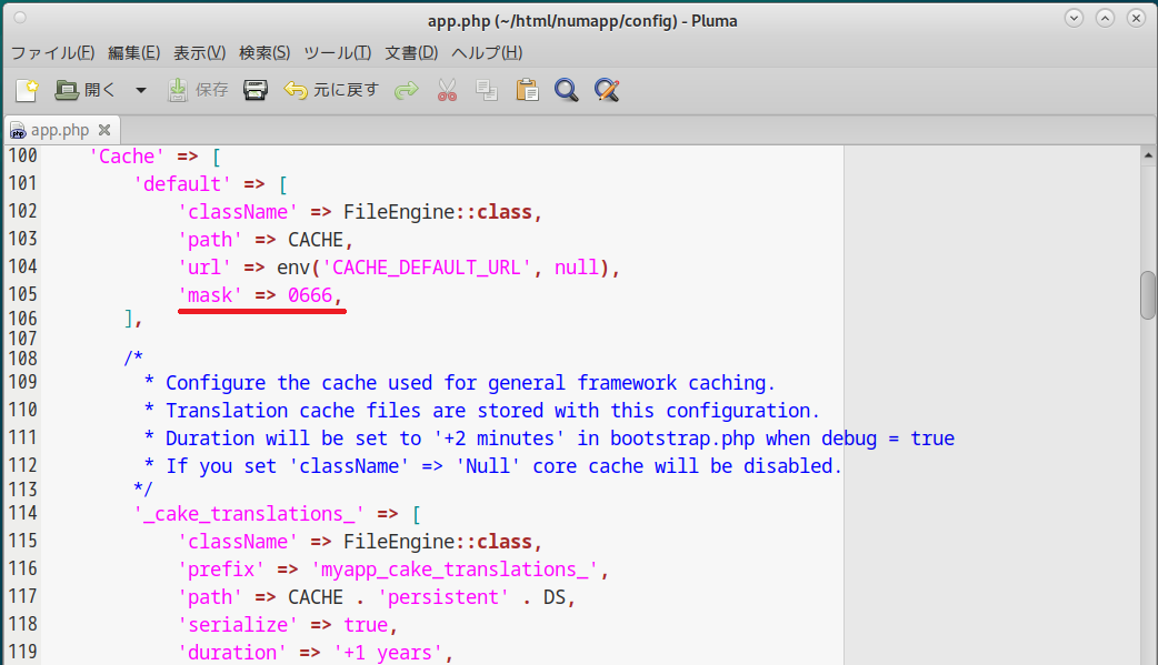 あ、「app.php」のほうには「mask」の設定(0666)も追加しておこう