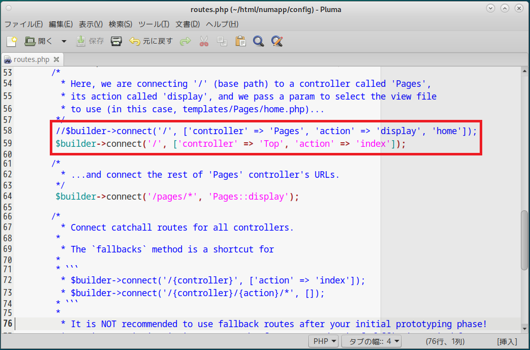 | 59 | - | $builder->connect('/', ['controller' => 'Top', 'action' => 'index']); | 追加 |