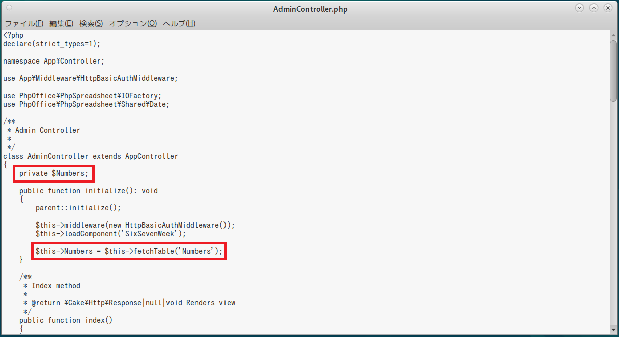 { private $Numbers; public function initialize(): void { parent::initialize(); $this->middleware(new HttpBasicAuthMiddleware()); $this->loadComponent('SixSevenWeek'); $this->Numbers = $this->fetchTable('Numbers'); } |