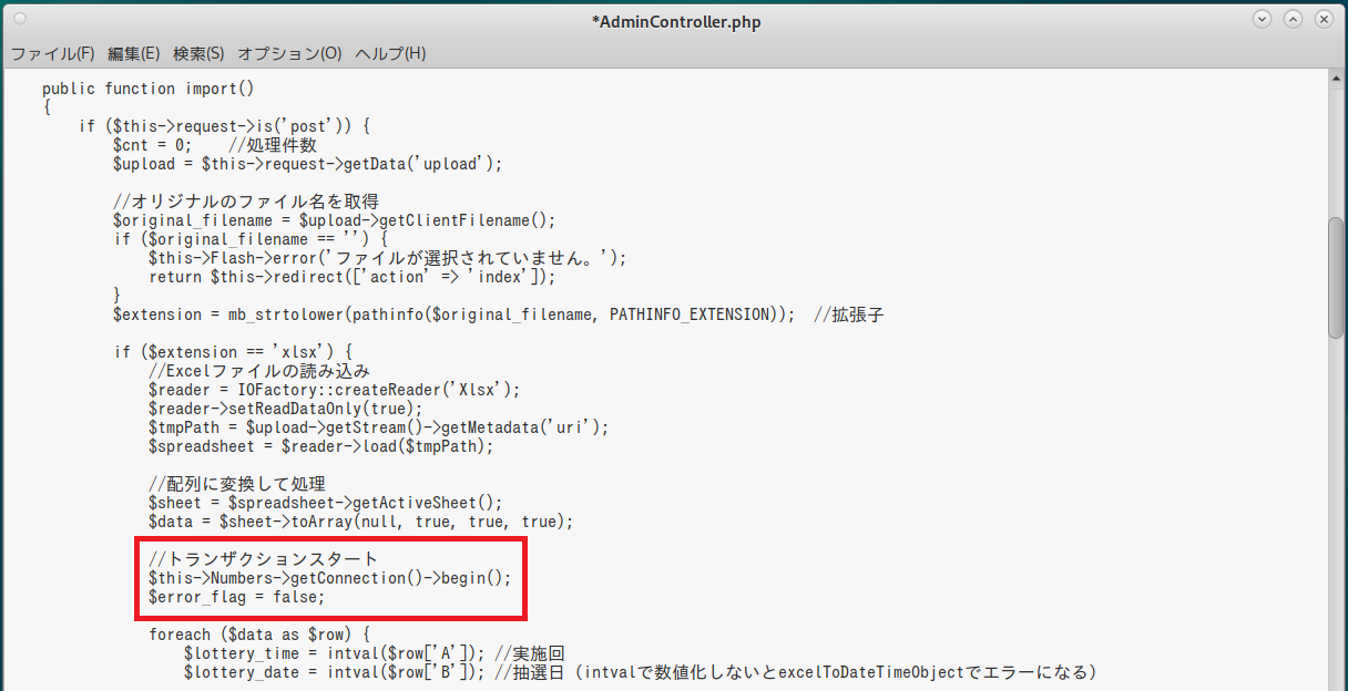 $this->Numbers->getConnection()->begin(); $error_flag = false; foreach ($data as $row) { ・・・ if (!$this->Numbers->save($numbers)) { $error_flag = true; break; } } if ($error_flag == false) { //コミット $this->Numbers->getConnection()->commit(); } else { //ロールバック $this->Numbers->getConnection()->rollback(); } |