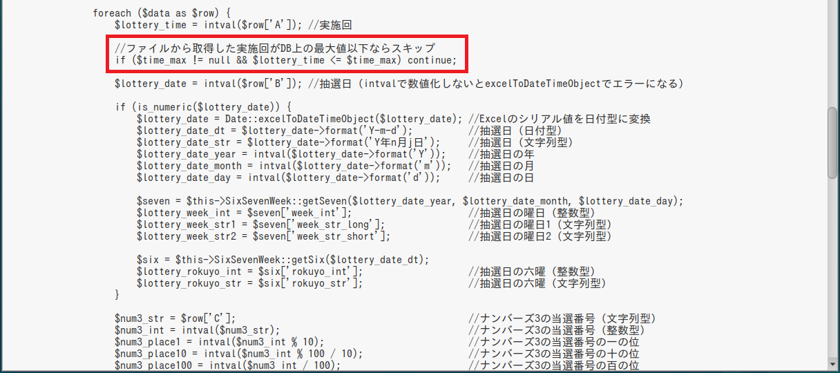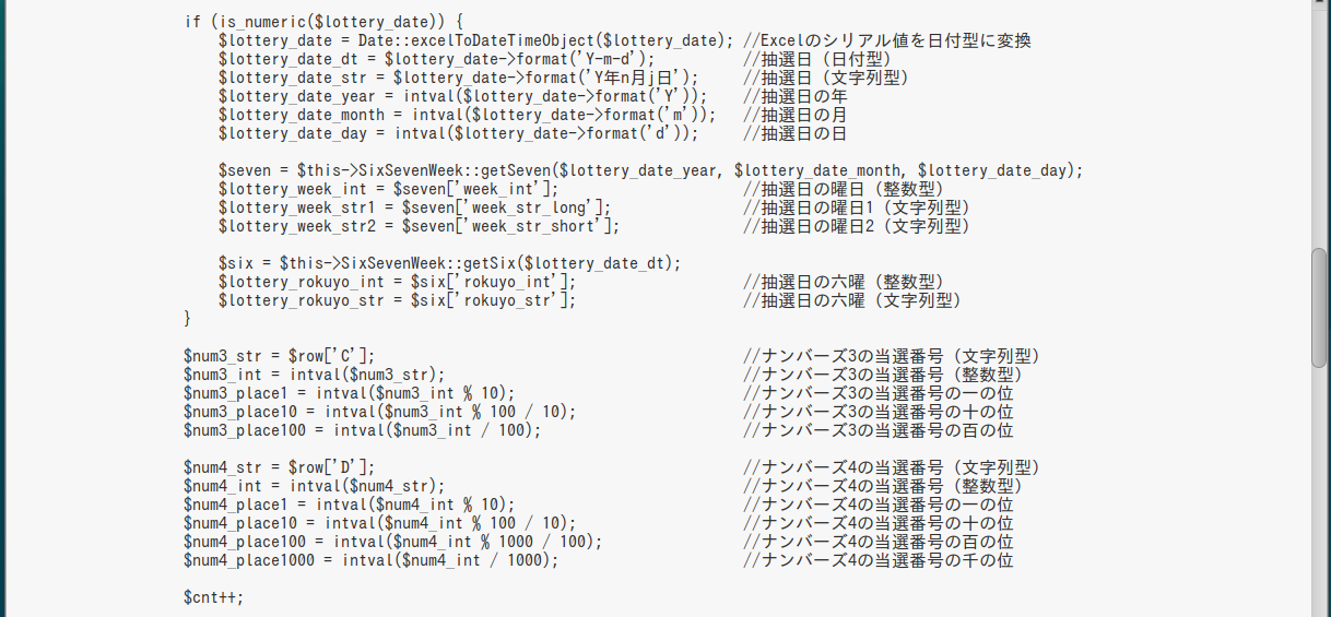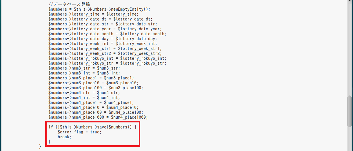 $numbers->lottery_time = $lottery_time; $numbers->lottery_date_dt = $lottery_date_dt; $numbers->lottery_date_str = $lottery_date_str; ・・・ |