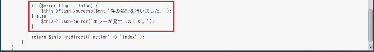 $this->Flash->success($cnt.'件の処理を行いました。'); } else { $this->Flash->error('エラーが発生しました。'); } |