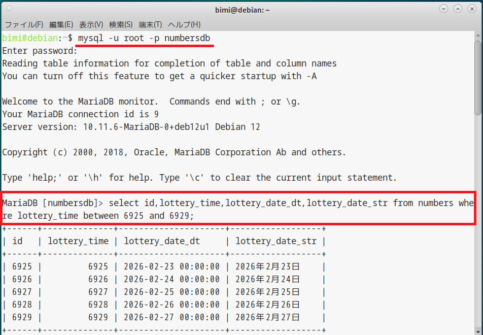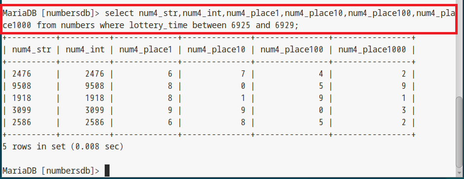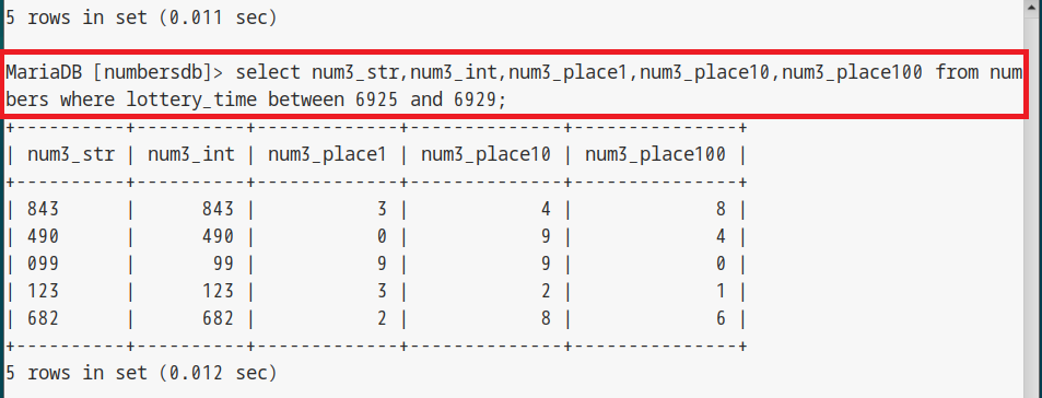 select lottery_date_year,lottery_date_month,lottery_date_day from numbers where lottery_time between 6925 and 6929; select lottery_week_int,lottery_week_str1,lottery_week_str2 from numbers where lottery_time between 6925 and 6929; select lottery_rokuyo_int,lottery_rokuyo_str from numbers where lottery_time between 6925 and 6929; select num3_str,num3_int,num3_place1,num3_place10,num3_place100 from numbers where lottery_time between 6925 and 6929; select num4_str,num4_int,num4_place1,num4_place10,num4_place100,num4_place1000 from numbers where lottery_time between 6925 and 6929; |