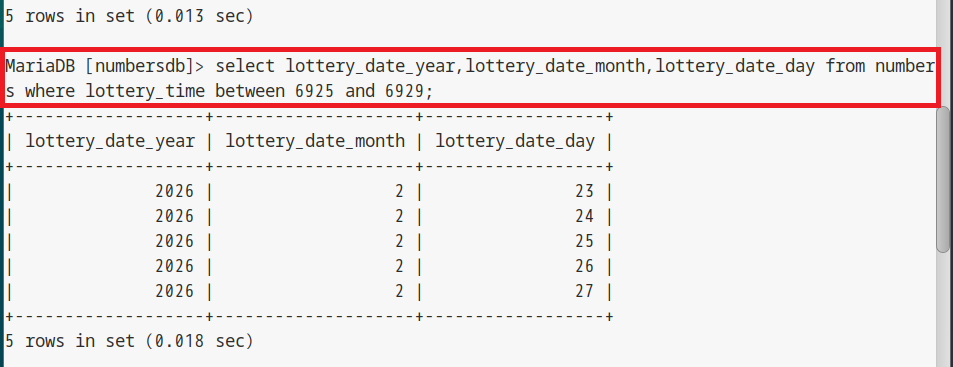 select id,lottery_time,lottery_date_dt,lottery_date_str from numbers where lottery_time between 6925 and 6929;