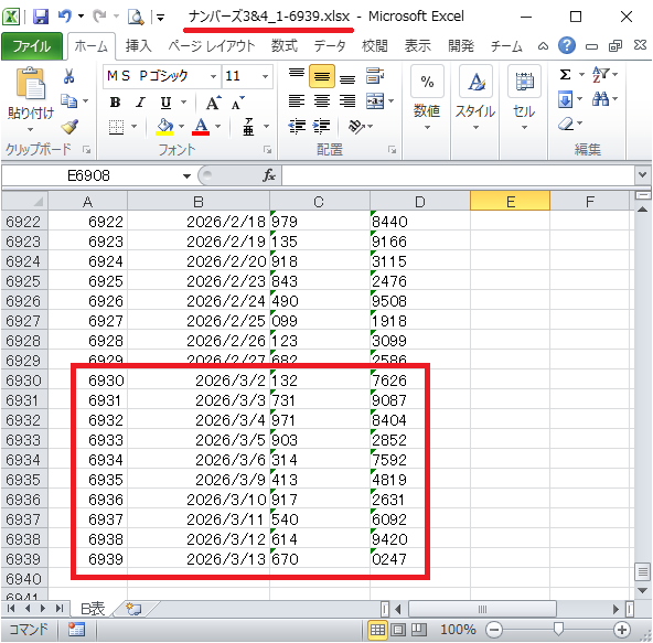 次は、さっきのファイルに10件追記された「ナンバーズ3&4_1-6939.xlsx」だね