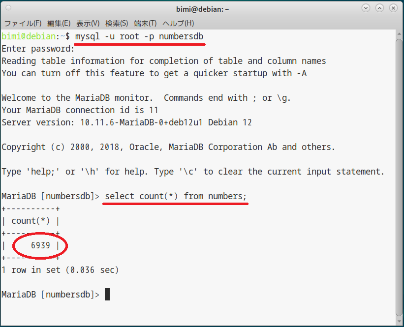 (本当は「select * from numbers」としたかったけど、表示が崩れちゃうんだよね(苦笑))