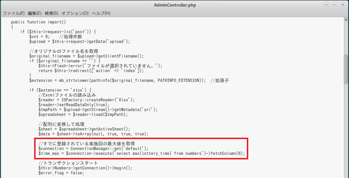 ・・・ $connection = ConnectionManager::get('default'); $sql = "select max(lottery_time) from numbers"; $results = $connection->execute($sql)->fetchAll('assoc'); |