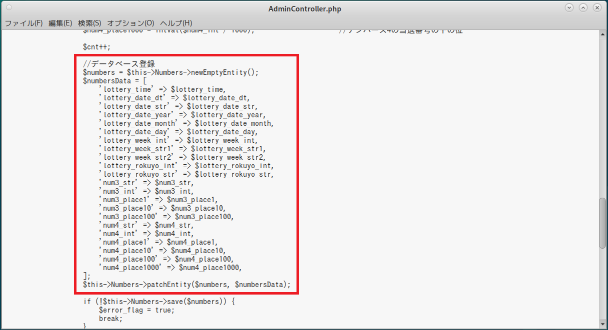 $numbersData = [ 'lottery_time' => $lottery_time, 'lottery_date_dt' => $lottery_date_dt, 'lottery_date_str' => $lottery_date_str, ・・・ ]; $this->Numbers->patchEntity($numbers, $numbersData); |