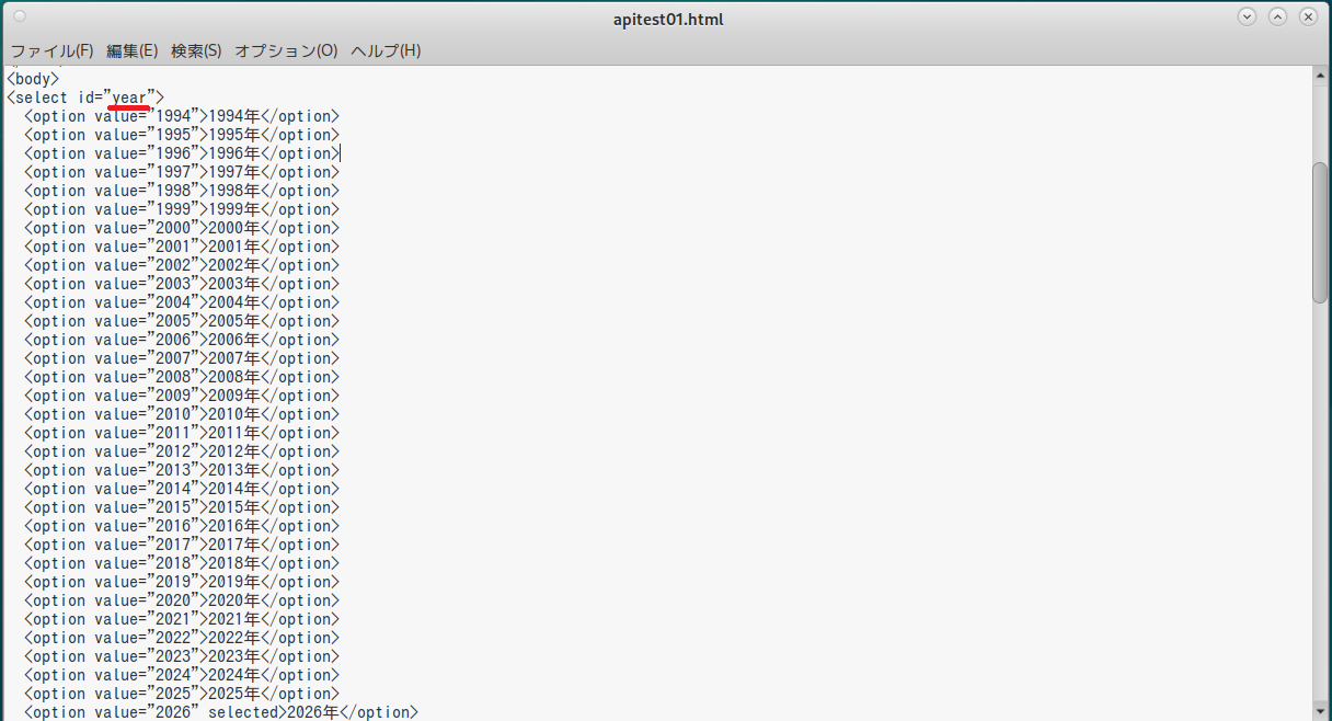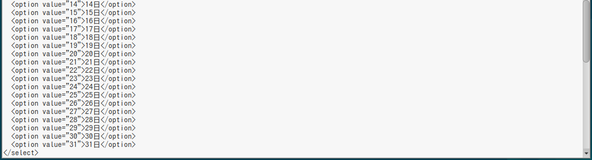 <option value="1994">1994年</option> <option value="1995">1995年</option> <option value="1996">1996年</option> ・・・(省略)・・・ <option value="2024">2024年</option> <option value="2025">2025年</option> <option value="2026" selected>2026年</option> </select> <select id="month"> <option value="1" selected>1月</option> <option value="2">2月</option> <option value="3">3月</option> ・・・(省略)・・・ <option value="10">10月</option> <option value="11">11月</option> <option value="12">12月</option> </select> <select id="day"> <option value="1" selected>1日</option> <option value="2">2日</option> <option value="3">3日</option> ・・・(省略)・・・ <option value="29">29日</option> <option value="30">30日</option> <option value="31">31日</option> </select> |