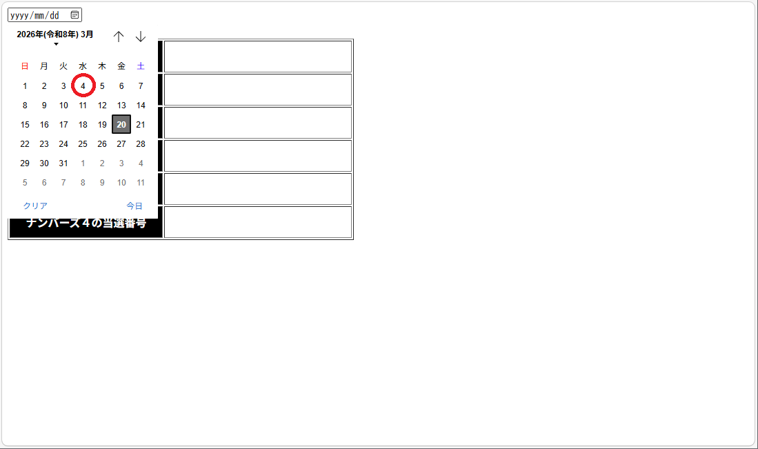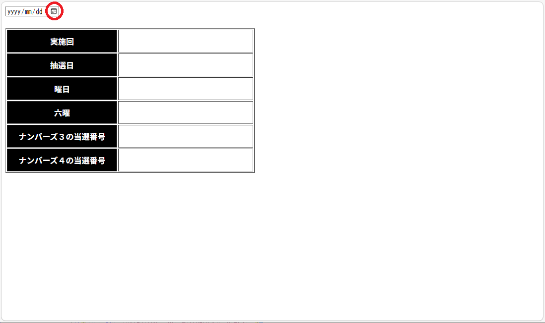 <tr><th>実施回</th><td id="lottery_time"></td></tr> <tr><th>抽選日</th><td id="lottery_date_str"></td></tr> <tr><th>曜日</th><td id="lottery_week_str1"></td></tr> <tr><th>六曜</th><td id="lottery_rokuyo_str"></td></tr> <tr><th>ナンバーズ3の当選番号</th><td id="num3_str"></td></tr> <tr><th>ナンバーズ4の当選番号</th><td id="num4_str"></td></tr> </table> |