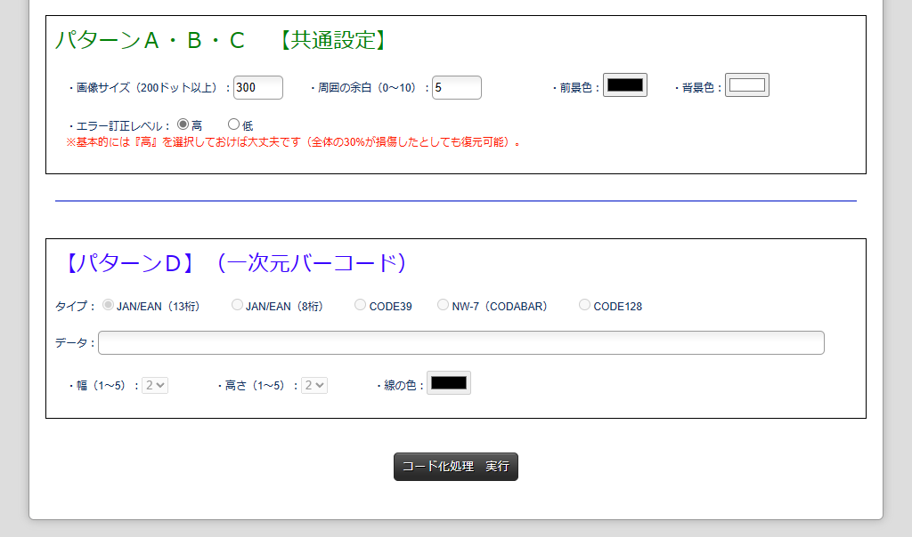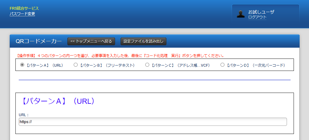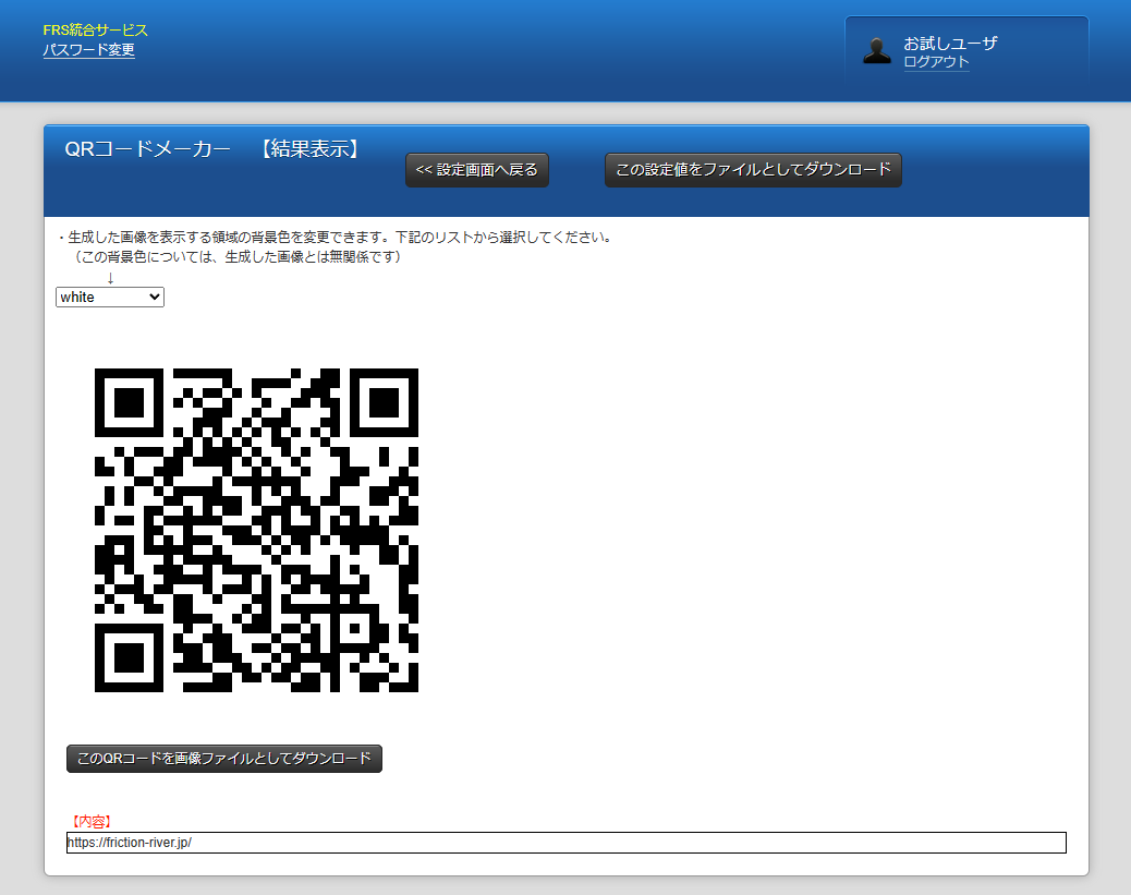 無料で利用できる『お試しユーザ』では設定自体を保存することはできませんが、QRコード生成とダウンロード(画像ファイルの保存)は可能です。