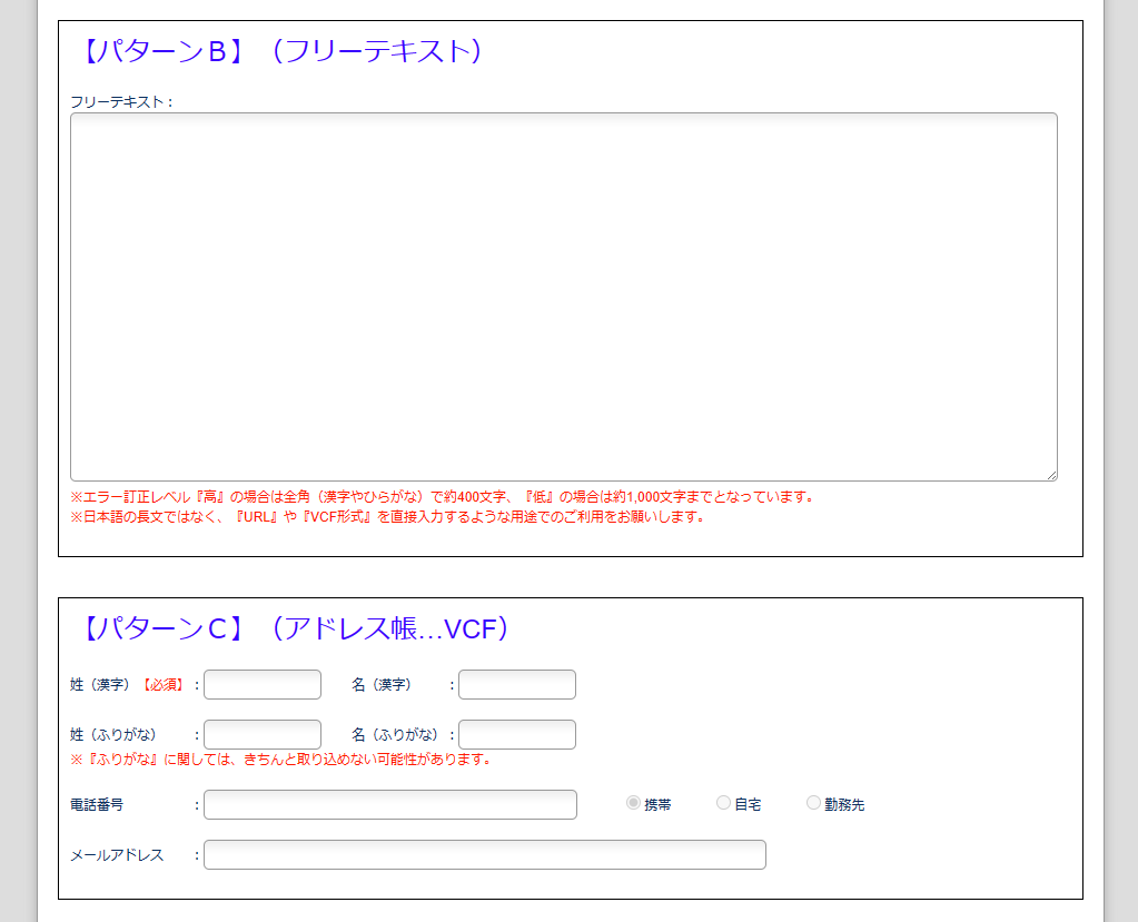 Webサイトへ簡単にジャンプするための『URL』や自由な文字列を入力できる『フリーテキスト』、スマホのアドレス帳に個人情報を取り込むための『vCard(VCF)形式』をQRコード化することができます。